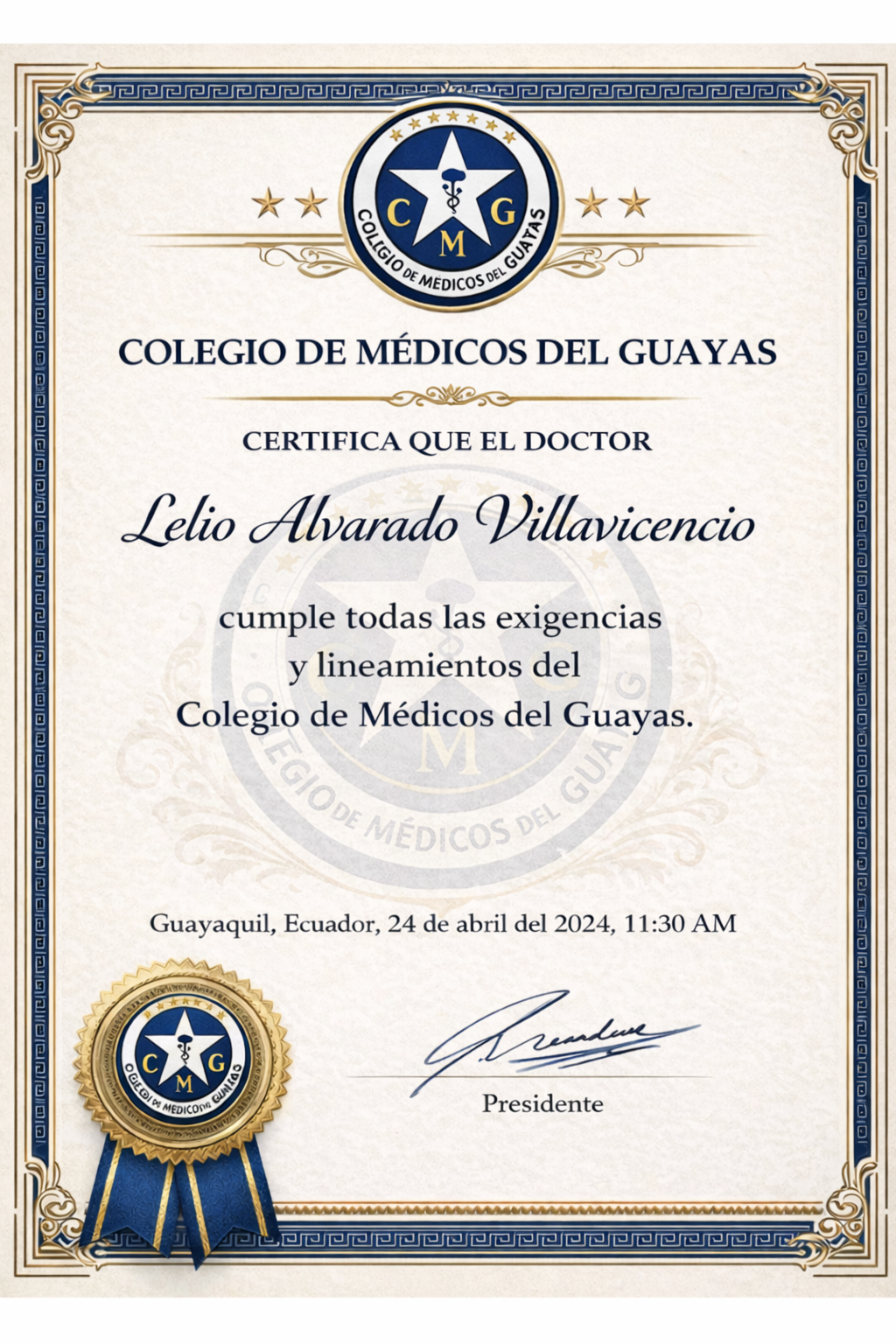• Especialista en Cardiología de la Universidad Católica de Santiago de Guayaquil