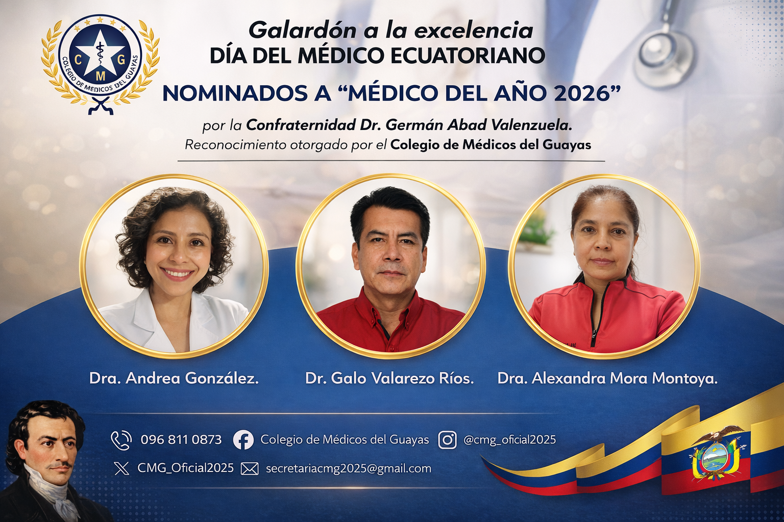 El Colegio de Médicos del Guayas rinde un merecido homenaje a los profesionales nominados al reconocimiento “𝗠𝗲́𝗱𝗶𝗰𝗼 𝗱𝗲𝗹 𝗔𝗻̃𝗼 𝟮𝟬𝟮𝟲”, una distinción que enaltece no solo la trayectoria individual, sino también el invaluable aporte que cada médico realiza desde su hospital, clínica, universidad, dispensario, fundación y confraternidad médica.